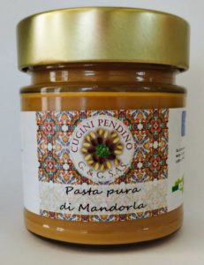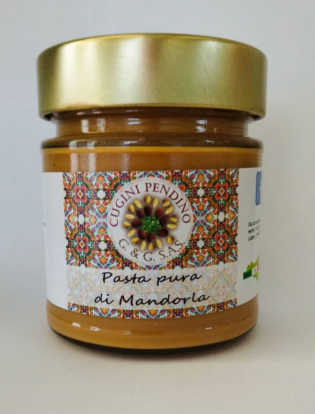 La pasta pura di mandorle 100% è un prodotto mono ingrediente , fatto esclusivamente con mandorle siciliane senza aggiunta di olio, senza zucchero,senza lattosio, spalmabile molto usata per la colazione o a merenda sul pane abbinata con frutta fresca.
